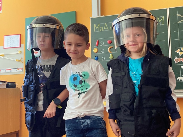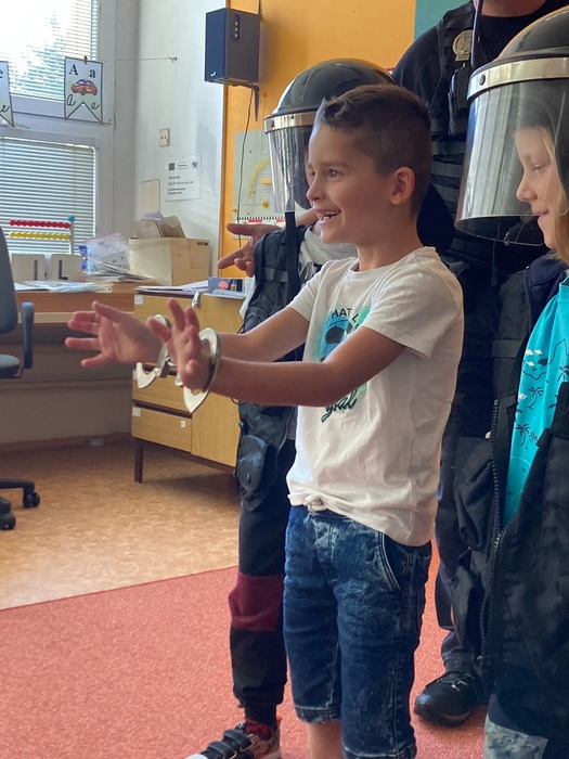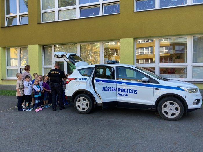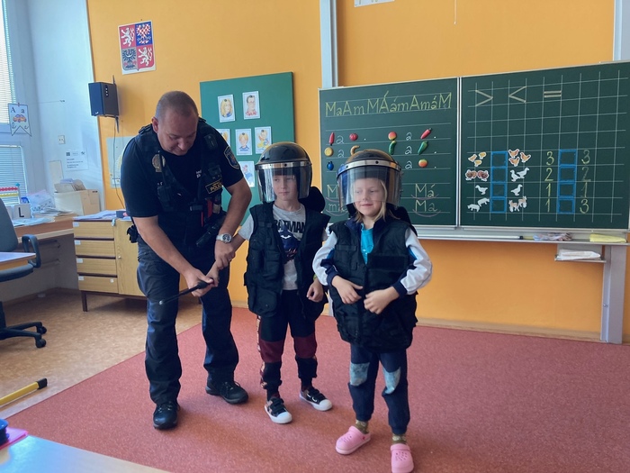 Ve středu nás ve škole navštívil strážník městské policie. Besedoval s prvňáčky, jak se mají chovat, aby se nedostali do nebezpečné situace, a jak si zavolat pomoc, kdyby se do ní dostali, jak se mají chovat coby chodci na chodníku, na přechodu pro chodce, v okolí svého bydliště i š