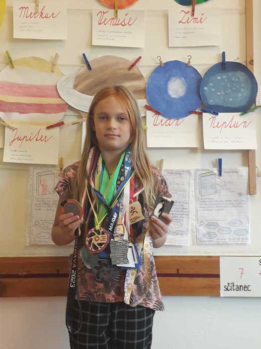 Na naši školu chodí do 4. B dívka, která má ve své sbírce mnoho medailí. Jen za 1. - 3. místa je jich nejméně 25!