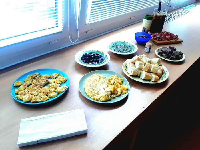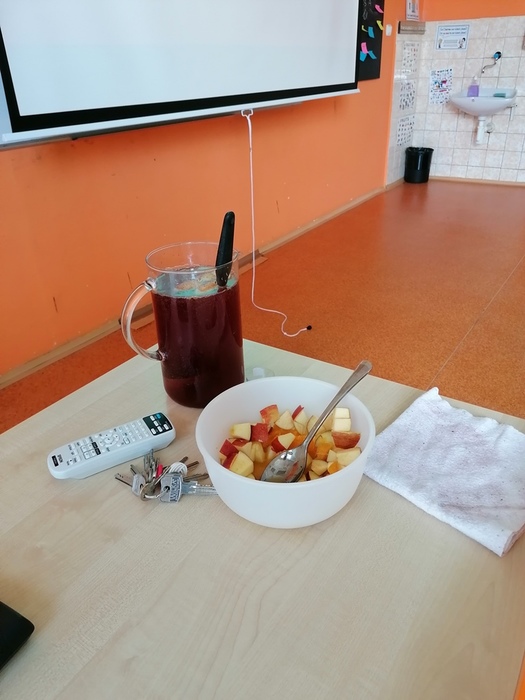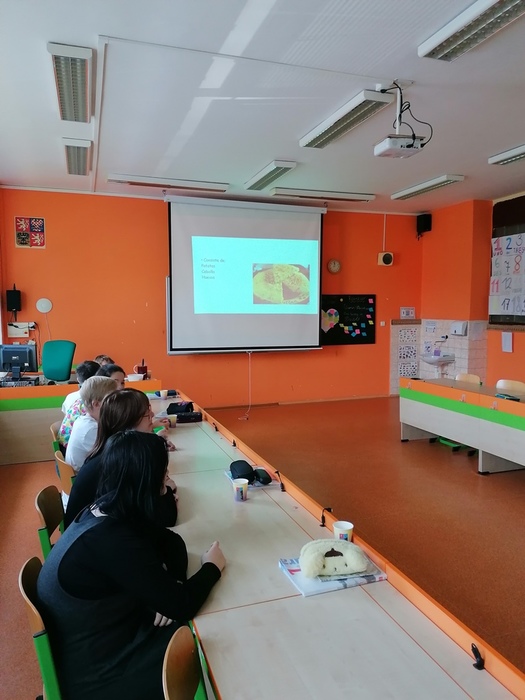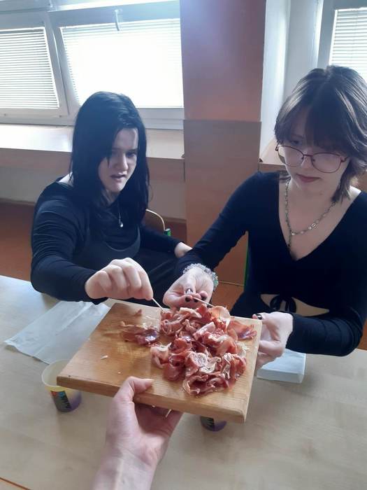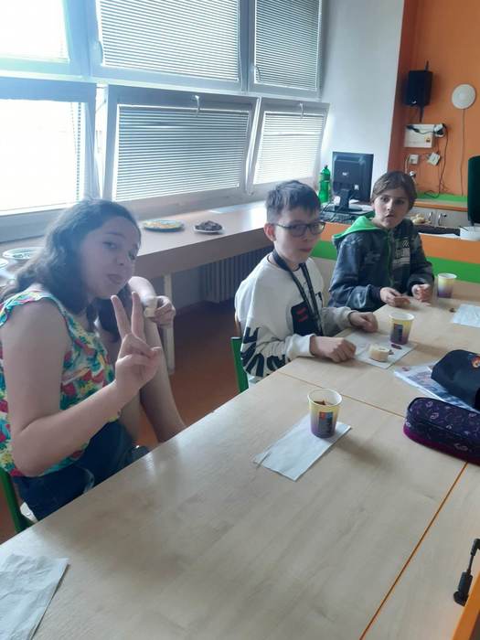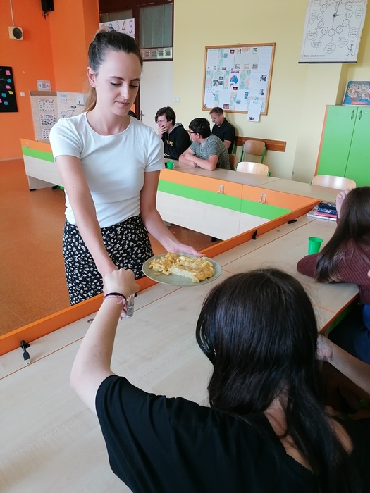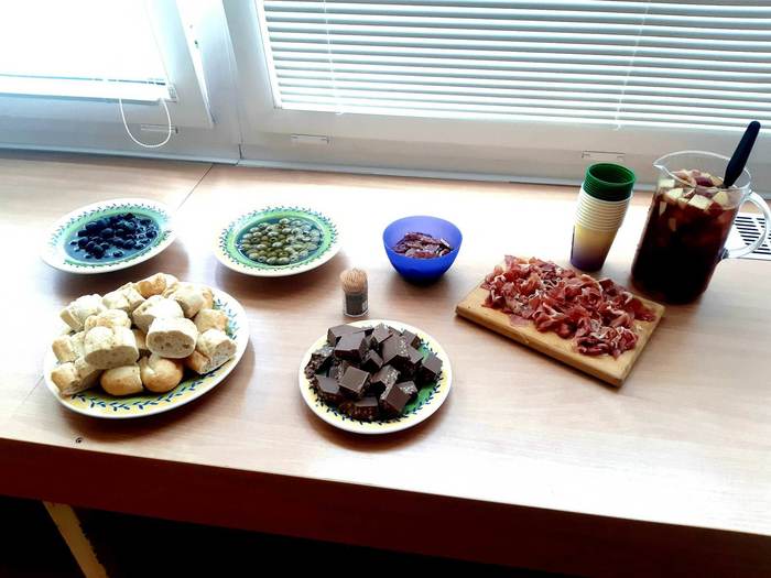 Na úterý jsme se s žáky španělštiny domluvili, že si uděláme ochutnávku španělského jídla. Nejdříve jsme vyzkoušeli nealkoholickou sangríu s ovocem. Poté následovala tortilla de patatas - klasické španělské jídlo z brambor, vajíček, cibule a olivového oleje. Následovaly různé 'pinchos' (jednohubky) jako olivy, jamón (španělská sušená šunka) a fuet (sušený salám z Katalánska). Ochutnávku jsme zakončili cukrovinkou nazývanou 'turrón', kterou bychom mohli přirovnat k českému tureckému medu.