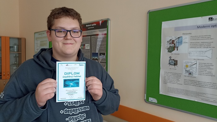 Saša zvládl školní kolo a postoupil do okresního kola, které se konalo ve středu 19. března v Karviné. I zde prokázal velmi dobrou úroveň fyzikálních znalostí a logického uvažování a stal se úspěšným řešitelem, umístil se na sdíleném 9. - 10. místě v okrese Karviná a postoupil do krajského kola. V minulém týdnu obdržel diplom úspěšného řešitele okresního kola FO. Gratulujeme!