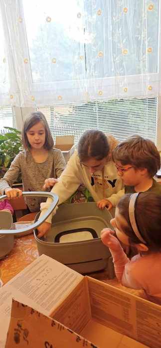 Po shlédnutí instruktážního videa si děti vermikompostér z šedého plastu samy sestavily. Jeho montáž nebyla nijak náročná. Po sestavení dna a vrchního patra natrhaly děti na dno na drobné kousky karton jako základ podestýlky. Na něj navrstvily speciální substrát. Pak už jen zbývalo umístit žížaly z malé krabičky do jejich nového domova. I když jsou žížaly hermafrodité, děti jim daly jméno Julie a Karel. Vermikompostér jsme umístili ve třídě na lehce přístupné místo, kde se mohou děti kdykoliv během dne na žížaly podívat.