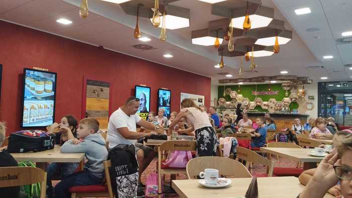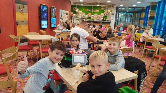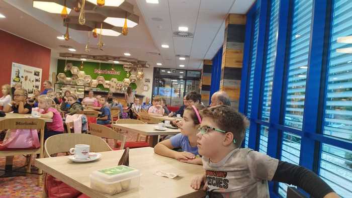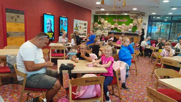 Ve čtvrtek 26. září ráno jsme děti přivedli jako obvykle ke škole, ale místo do třídy jsme společně zamířili k OD Orel, kde na nás čekal autobus. Na dětech šla vidět radost a napětí, jelikož věděly, že se nebudou učit a místo učení pojedou do továrny na medové dobroty - Marlenky. Cesta nám nezabrala ani třičtvrtě hodiny, při které nám rodičům a panu řidiči děti s paní učitelkou cestu zpříjemnily zpěvem. Za mne velice pěkná vsuvka od hudební třídy, která mne vrátila do dětských let, kdy i já jezdíval na výlety a soustředění a cestou jsme se spolužáky zpívali. Po příjezdu do Frýdku - Místku k areálu Marlenky děti horlivě vystoupily a s nadšením spěchaly ke vstupu do medové továrny. Jelikož jsme dorazili s menším předstihem, prohlédli jsme si i přilehlý dětský park, na který bohužel a možná i naštěstí nebylo dost času, aby se děti mohly rozdovádět.