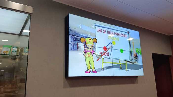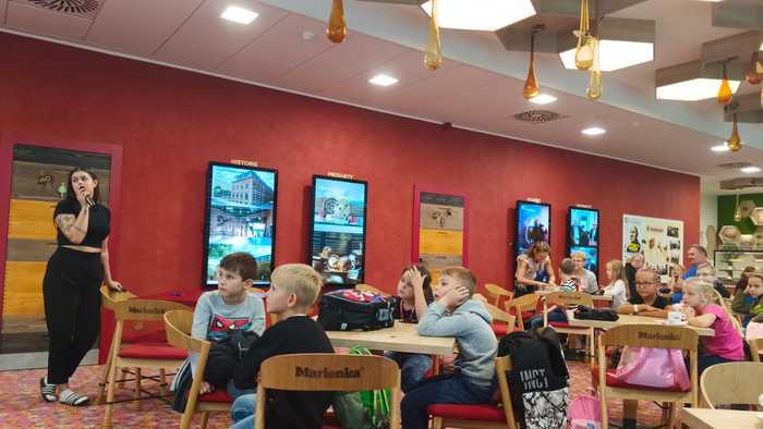 O chvilku později jsme už vstupovali do prostor továrny, kde nás všechny hned u vstupu  zaujaly makety vyrobených dortů, určené pro slavné osobnosti, a rekvizity pro pohádku Když draka bolí hlava. Všimli jsme si i podnikové prodejny, kterou jsme mimo jiné při odchodu všichni navštívili.                   Po uvedení do sálu, kde jsme se pohodlně usadili, se o nás pohádkově postaraly zaměstnankyně továrny, které nám během krátké videoprezentace v čele s maskotem dvouhlavým drakem přinesly občerstvení, medové dobroty a dospělým kávu Marlenka. Poté se nás ujala paní průvodkyně, která nás seznámila s historií vzniku závodu a představila nám celé portfolio výrobků. Po prezentaci nás čekala prohlídka výrobní haly, kde jsme se seznámili s hygienou, a bezpečností práce v Marlence. .  Děti se zájmem sledovaly celý proces výroby všech dortů a kuliček i snacků. Prohlídku jsme zakončili nákupem medových dobrot v již zmíněné podnikové prodejně. Cesta domů  probíhala v poklidu, protože mnohé z děti si cestou zpět zdřímly. Z mého pohledu pěkný výlet, který děti zaujal a nám rozšířil znalosti, jak taková továrna funguje.  Za dospělé i děti z naší třídy zapsal